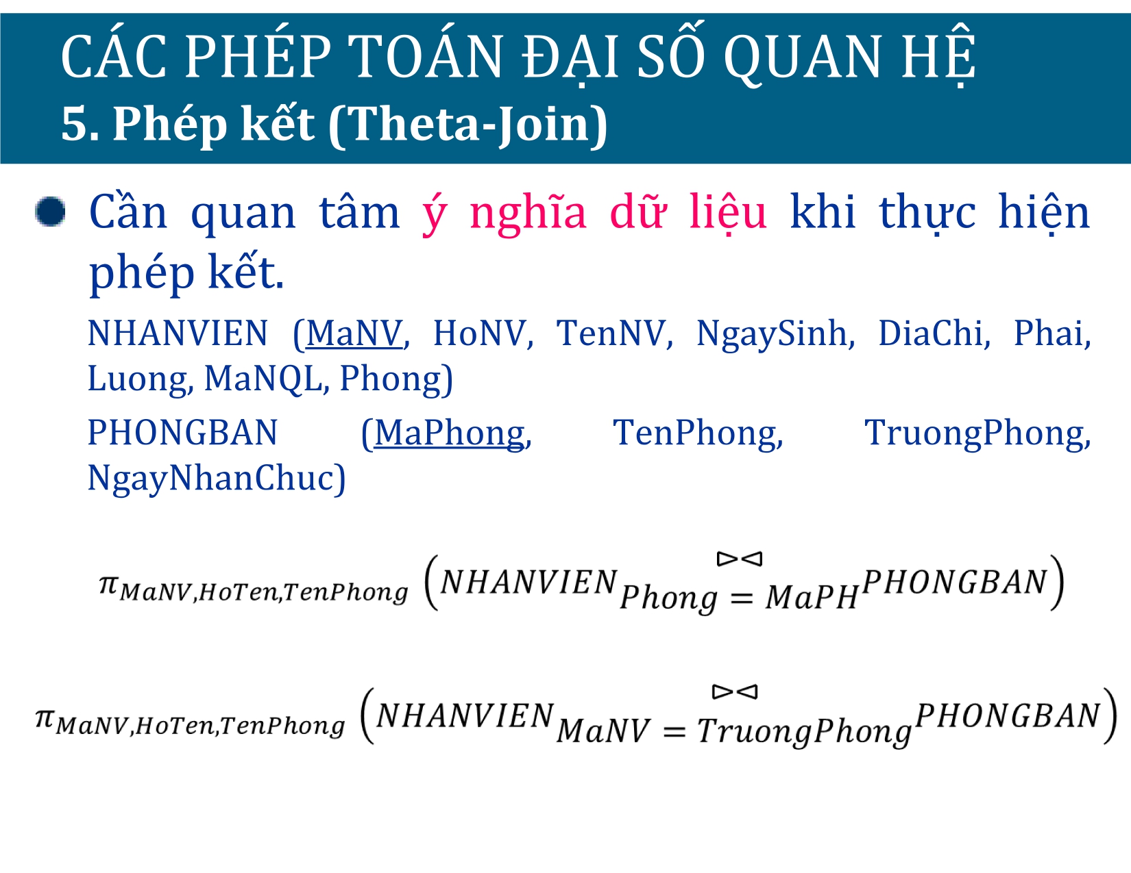- Quan hệ: chọn, chiếu, đổi tên, kết, chia